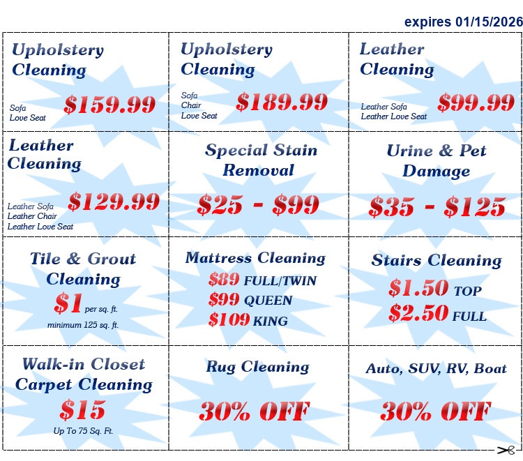 Carpet Maintenance | Carpet Cleaning Information | Carpet Repair | Sanitizing and Deodorizing | Privacy Policy | Before and After | Mattress Cleaning | Re-stretching | Bonded Inserts | Carpet Stain Removal | Videos | Equipment we use | Carpet Protection Guard | Allergy Control | Carpet Cleaning | Cleaning Tips | Terms and Conditions | Upholstery Cleaning | Service Area | Pet Odor Control | Organic Cleaning | Marble Restoration | Leather Cleaning | Grout and Tile Cleaning | Fire and Water Damage | Fine Rug Cleaning | Drape and Curtain Cleaning | Commercial Carpet Cleaning |